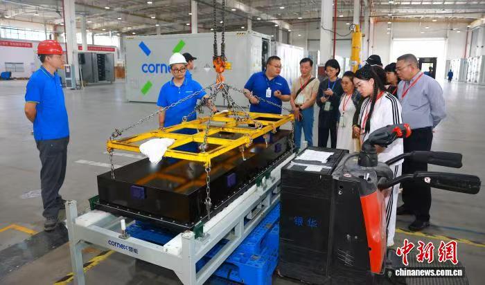 图为宜昌楚能工作人员向参访者展示电池集装箱。 张畅 摄