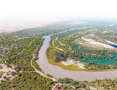 新疆巴音郭楞蒙古自治州尉犁县塔克拉玛干沙漠边缘,塔里木河蜿蜒流淌,两岸胡杨生机勃勃。汪志鹏摄(人民视觉)
