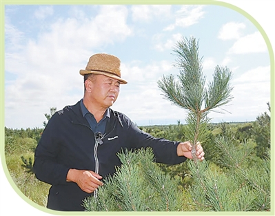 内蒙古通辽市科尔沁左翼后旗“双百万亩”项目区,朝克吐正在查看樟子松嫁接红松的长势情况。冯新蕾摄