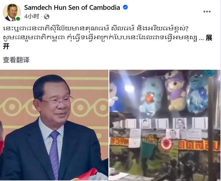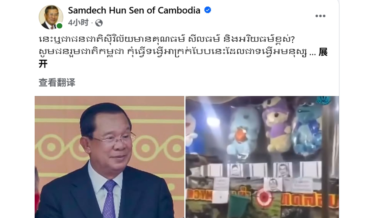 洪森亲王同时附上了该泰国人将他照片张贴在射击靶上进行射击游戏的视频截图,作为事件的佐证。