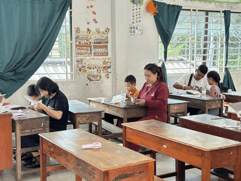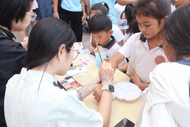 值得一提的是,礼堂活动之外,操场上的互动体验同样人气高涨。援柬教师与本地教师耐心指导孩子用橡皮泥制作“月饼”,揉、压、刻、印,一个个形态可爱的“月饼”新鲜“出炉”;脸部彩绘、胳膊彩绘摊位前,孩子们依旧热情不减,用绚丽的图案迎接节日。