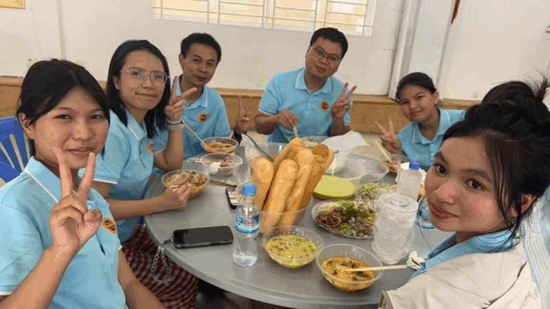 中午时分,礼堂变身为温馨的“团圆餐厅”,援柬教师与本地教师欢聚一堂,共享月饼与特色美食。香甜的月饼寓意团圆,可口的菜肴传递温暖,老师们畅谈活动趣事,分享教学心得,欢声笑语中,中柬教育者的友谊愈发深厚。