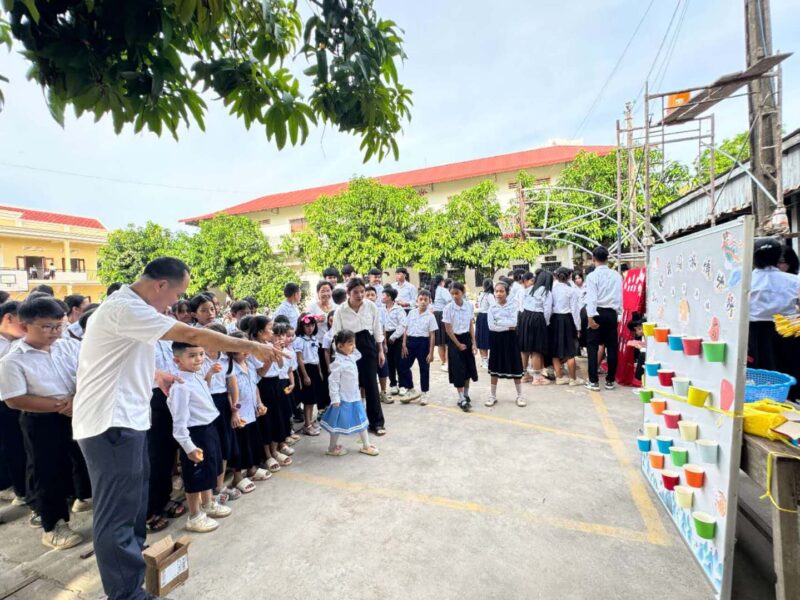 文艺环节落幕,中柬双语主持人再次登场,宣布趣味游戏互动开启,猜灯谜、“好运乒乓球”、传统投壶三大项目瞬间点燃学生热情,几乎全员参与其中。猜灯谜区,学生们围绕中英文谜题热烈讨论,破解成功的欢呼不绝于耳;“好运乒乓球”前,大家排队投掷,成功将球投进纸杯即可赢得小零食,笑容洋溢在每个人脸上;投壶区则充满竞技趣味,学生两人一组PK,在瞄准与投掷间体验古老游戏的乐趣。此外,学校门口的中秋拍照打卡立牌,凭借玉兔、祥云等元素成为“热门景点”,众多学生驻足留影,部分学生还主动献唱,现场氛围热烈融洽。