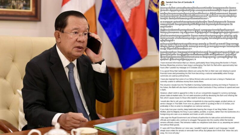 洪森亲王同时指出,泰铢在柬埔寨境内的持续流通,已经对柬埔寨公民的利益构成不利影响。他提到:“据我所知,在泰国工作或做生意的柬埔寨公民无法在泰国银行取款。这说明泰铢正在伤害柬公民的利益。若我们继续在境内流通,未来将对柬埔寨公民产生不利影响。”