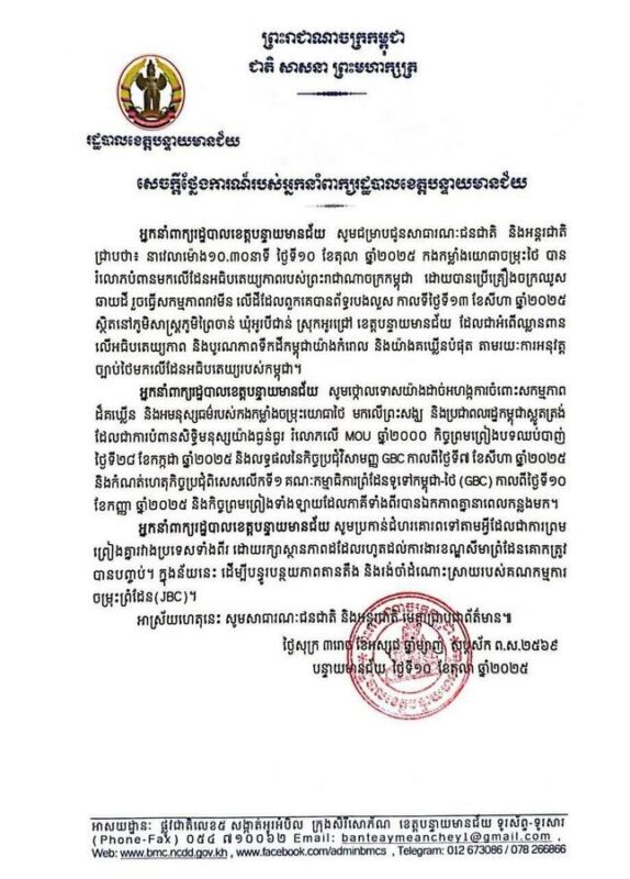 អ្នកនាំពាក្យរដ្ឋបាលខេត្តបន្ទាយមានជ័យ ថ្កោលទោសកងទ័ពថៃដែលប្រើគ្រឿងចក្រឈូសឆាយដី និងរាវមីនរំលោភដែនអធិបតេយ្យនៅភូមិព្រៃចាន់ ឃុំអូរបីជាន់ ភាសាខ្មែរ -2025/10/11 538 ចេញផ្សាយ ថ្ងៃទី ១១ ខែ តុលា ឆ្នាំ ២០២៥ 责编 ek © 《柬华日报》版权所有 - Advertise -