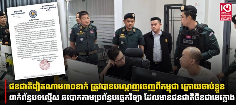 ជនជាតិវៀតណាម៣០នាក់ ត្រូវបានបណ្តេញចេញពីកម្ពុជា ក្រោយចាប់ខ្លួនពាក់ព័ន្ធបទល្មើស ឆបោកតាមប្រព័ន្ធបច្ចេកវិទ្យា ដែលមានជនជាតិចិនជាមេក្លោង