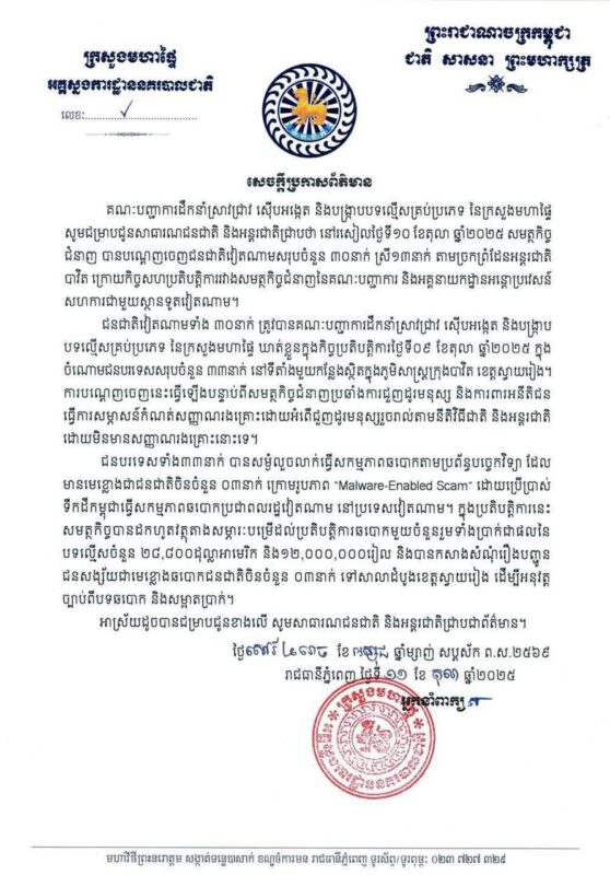 ជនបរទេសទាំង៣៣នាក់ បានសម្ងំលួចលាក់ធ្វើសកម្មភាពឆបោកតាមប្រព័ន្ធបច្ចេកវិទ្យា ដែលមានមេខ្លោងជាជនជាតិចិនចំនួន ០៣នាក់ ក្រោមរូបភាព “Malware-Enabled Scam” ដោយប្រើប្រាស់ ទឹកដីកម្ពុជាធ្វើសកម្មភាពឆបោកប្រជាពលរដ្ឋវៀតណាម នៅប្រទេសវៀតណាម។