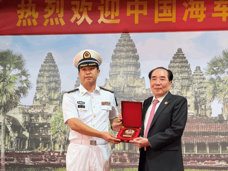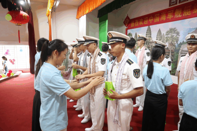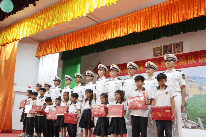 致辞结束后,双方互赠纪念品以示友谊。中国海军官兵向港华学校赠送了文具、书包等学习用品,表达对孩子们的关怀与鼓励。郑源来会长代表学校向中国海军赠送纪念礼品,学校教师还特意为海军代表献上具有柬埔寨民族特色的水布,以示敬意与感谢。礼品交换的仪式简短而温馨,充分展现了中柬两国人民之间真挚的友好情谊。