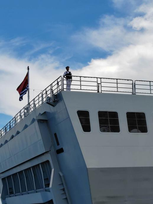 正午登舰:军舰上的友好交流 抵达西港码头时,戚继光舰与沂蒙山舰正静泊港内,舰身悬挂的中柬旗帜在阳光下鲜明夺目。