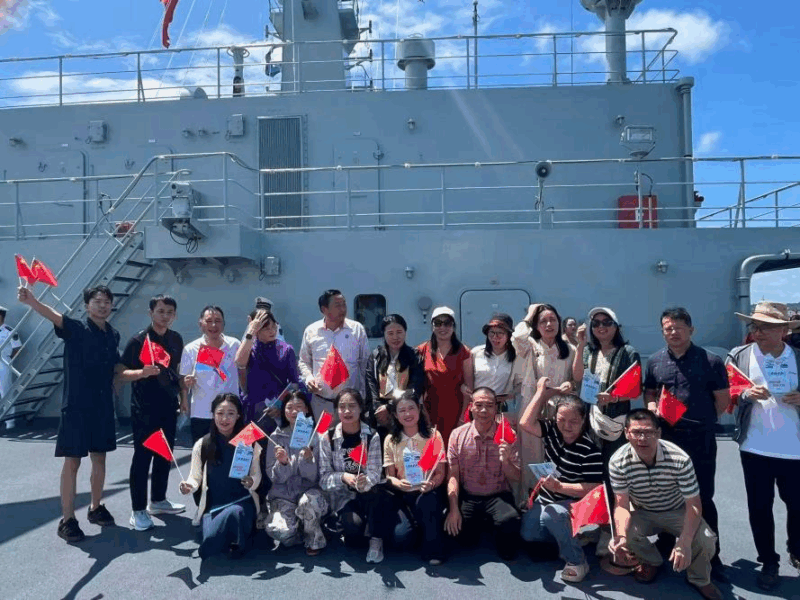 阳光下,大家手持小国旗,与巍峨军舰形成生动画面,记录下此次特殊的参观时刻。期间,海军官兵还为教师们送上参观纪念册,册页印有”戚继光舰”相关标识,成为此行的珍贵纪念。 归程心声:爱国情感满溢,参观结束后,教师们于西港短暂休整便返程金边。