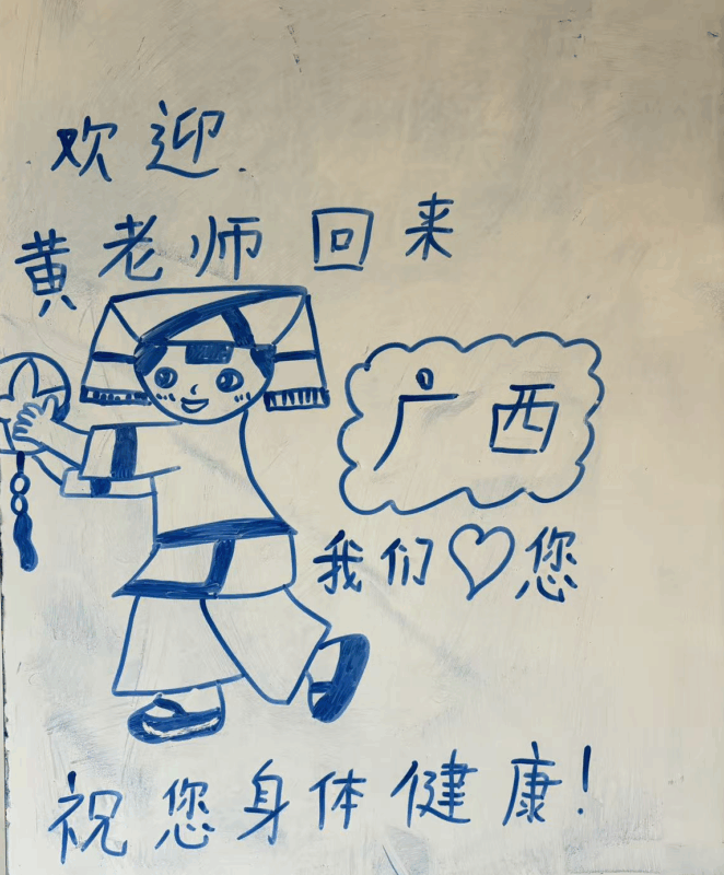 经过一段时间的治疗,黄老师的身体逐渐康复了。回到学校,孩子们纷纷到房间探望她,那一张张天真无邪的笑脸和热情的拥抱,还有白板上那惟妙惟肖的肖像画和工整的中文“欢迎黄老师回来!”“我们爱您!”“祝您身体健康!”,让她更加坚定了安心在这里继续援教的决心。