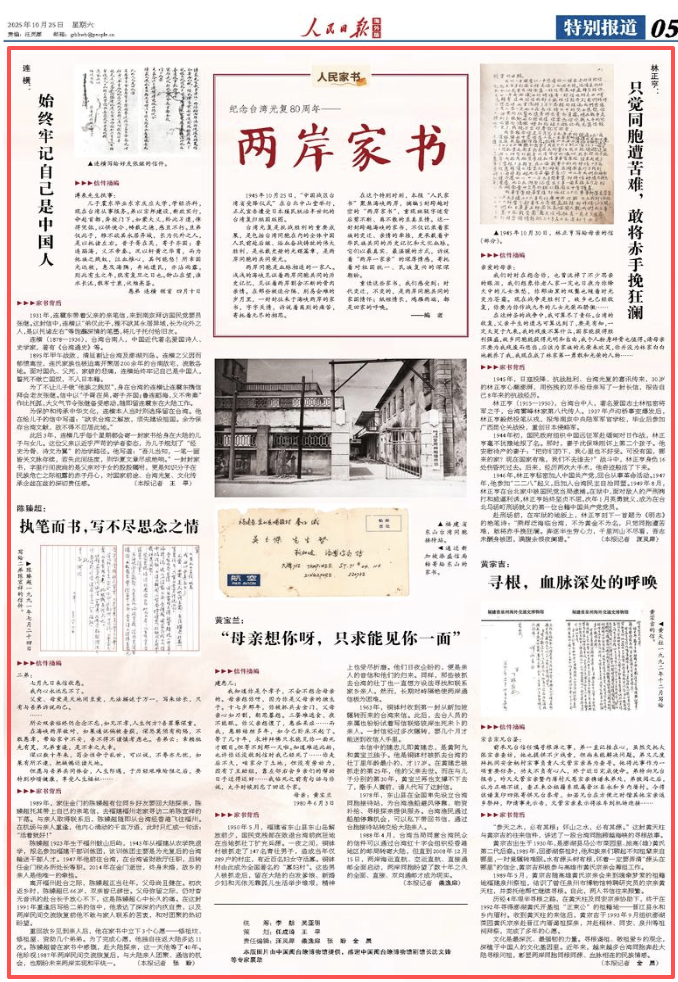 在这个特别时刻,本报“人民家书”聚焦海峡两岸,摘编5封跨越时空的“两岸家书”,重现斑驳字迹背后剪不断、离不散的至真至情。这一封封跨越海峡的家书,不仅记录着家族的变迁、亲情的牵挂,更承载着中华民族共同的历史记忆和文化血脉。它们以最真实、最温暖的方式,诉说着“两岸一家亲”的深厚情感,寄托着对祖国统一、民族复兴的深深期盼。