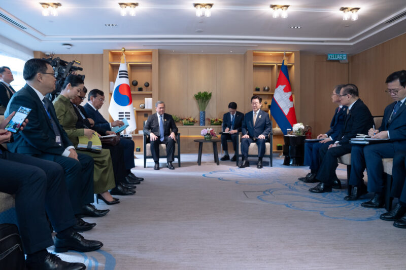 សម្តេចបវរធិបតី ហ៊ុន ម៉ាណែត នាយករដ្ឋមន្ត្រីនៃកម្ពុជា នៅព្រឹកថ្ងៃទី២៧ ខែតុលា ឆ្នាំ២០២៥នេះ បានជួបពិភាក្សាការងារទ្វេភាគីជាមួយលោក Lee Jae Myung ប្រធានាធិបតីនៃសាធារណរដ្ឋកូរ៉េ ក្នុងឱកាសអញ្ជើញចូលរួមកិច្ចប្រជុំកំពូលអាស៊ានលើកទី៤៧ នៅទីក្រុងកូឡាឡាំពួ ប្រទេសម៉ាឡេសុី។