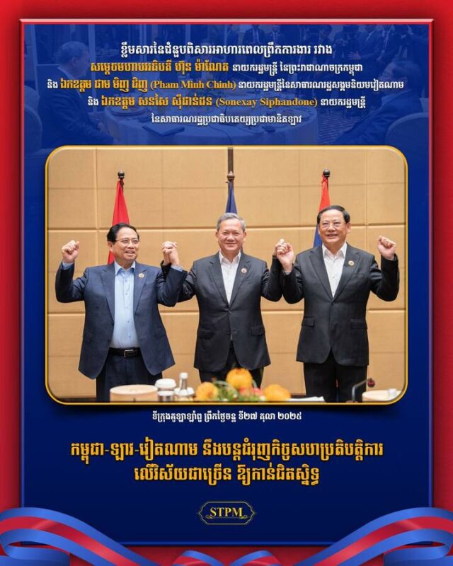 សម្តេចមហាបវរធិបតី ហ៊ុន ម៉ាណែត នាយករដ្ឋមន្រ្តី នៃព្រះរាជាណាចក្រកម្ពុជា បានរៀបចំអាហារពេលព្រឹកការងារ ជាមួយ ឯកឧត្តម ផាម មិញ ជិញ (Pham Minh Chinh) នាយករដ្ឋមន្រ្តីនៃសាធារណរដ្ឋសង្គមនិយមវៀតណាម និង ឯកឧត្តម សនសៃ ស៊ីផាន់ដន (Sonexay Siphandone) នាយករដ្ឋមន្រ្តីនៃសាធារណរដ្ឋប្រជាធិបតេយ្យប្រជាមានិតឡាវ ក្នុងឱកាសចូលរួមកិច្ចប្រជុំកំពូលអាស៊ាន លើកទី៤៧ និងកិច្ចប្រជុំកំពូលពាក់ព័ន្ធ នៅទីក្រុងគូឡាឡាំពួ ប្រទេសម៉ាឡេស៊ី ពីថ្ងៃទី២៦-២៨ ខែតុលា ឆ្នាំ២០២៥។