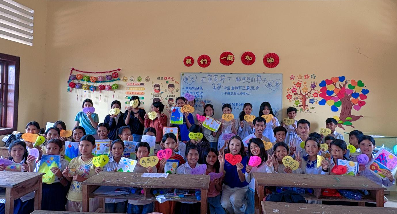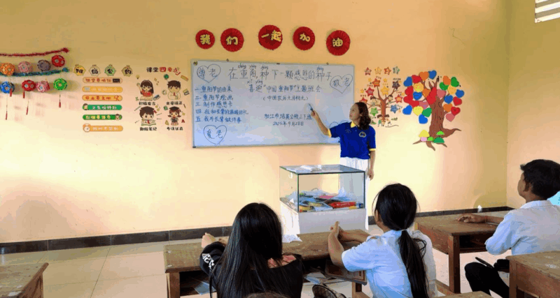 当我将重阳节的故事和传统习俗带到柬埔寨的课堂上,孩子们眼中闪烁着好奇与期待。我跟他们讲述着中国古代人们在重阳节登高祈福、插茱萸、饮菊花酒的故事,孩子们听得全神贯注,仿佛穿越时空,走进了古老而神秘的中国。他们对这个遥远国度的节日充满了兴趣,有的孩子提出了问题:为什么要登高?茱萸是什么样子的?我耐心地解答着他们的疑问,努力让他们更深入地了解这个蕴含着“尊老”、“敬老”、“爱老”、“助老”深厚文化内涵的节日。