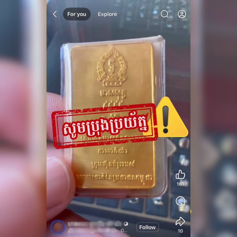 据通告显示,近期,社交媒体上出现一些帖子和信息,展示印有柬埔寨国家银行标志的“金箔”,并配文宣称其为“真正来自柬埔寨银行的黄金”,此举已引发社会广泛关注。