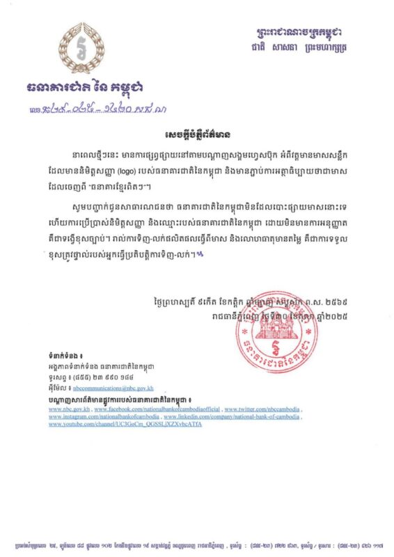 ធនាគារជាតិនៃកម្ពុជា នៅថ្ងៃទី៣០ ខែតុលា ឆ្នាំ២០២៥នេះ បានចេញសេចក្តីប្រកាសព័ត៌មាន ដោយអំពាវនាវដល់សាធារណជន មេត្តាប្រុងប្រយ័ត្ន ចំពោះការផ្សព្វផ្សាយលក់ «មាសសន្លឹក» ដែលថាចេញដោយធនាគារជាតិ។ ធនាគារជាតិនៃកម្ពុជា បញ្ជាក់ថា ខ្លួនមិនដែលបោះផ្សាយមាសនោះទេ។