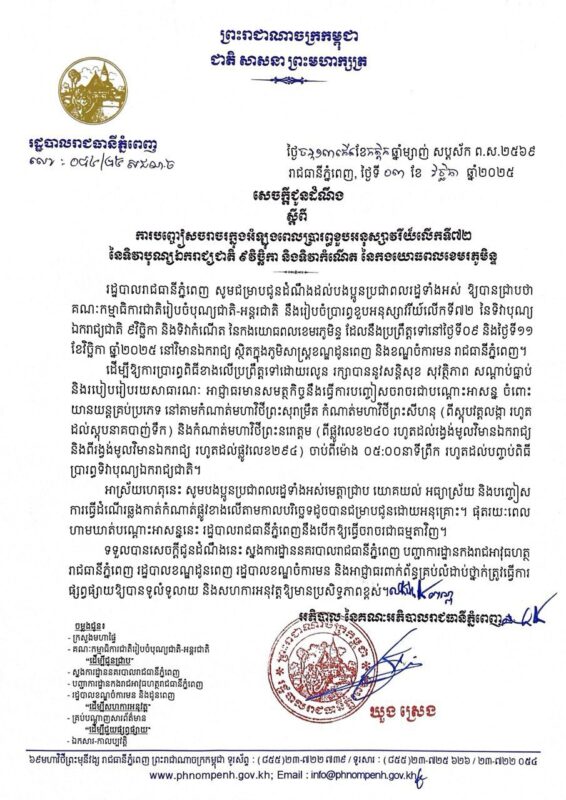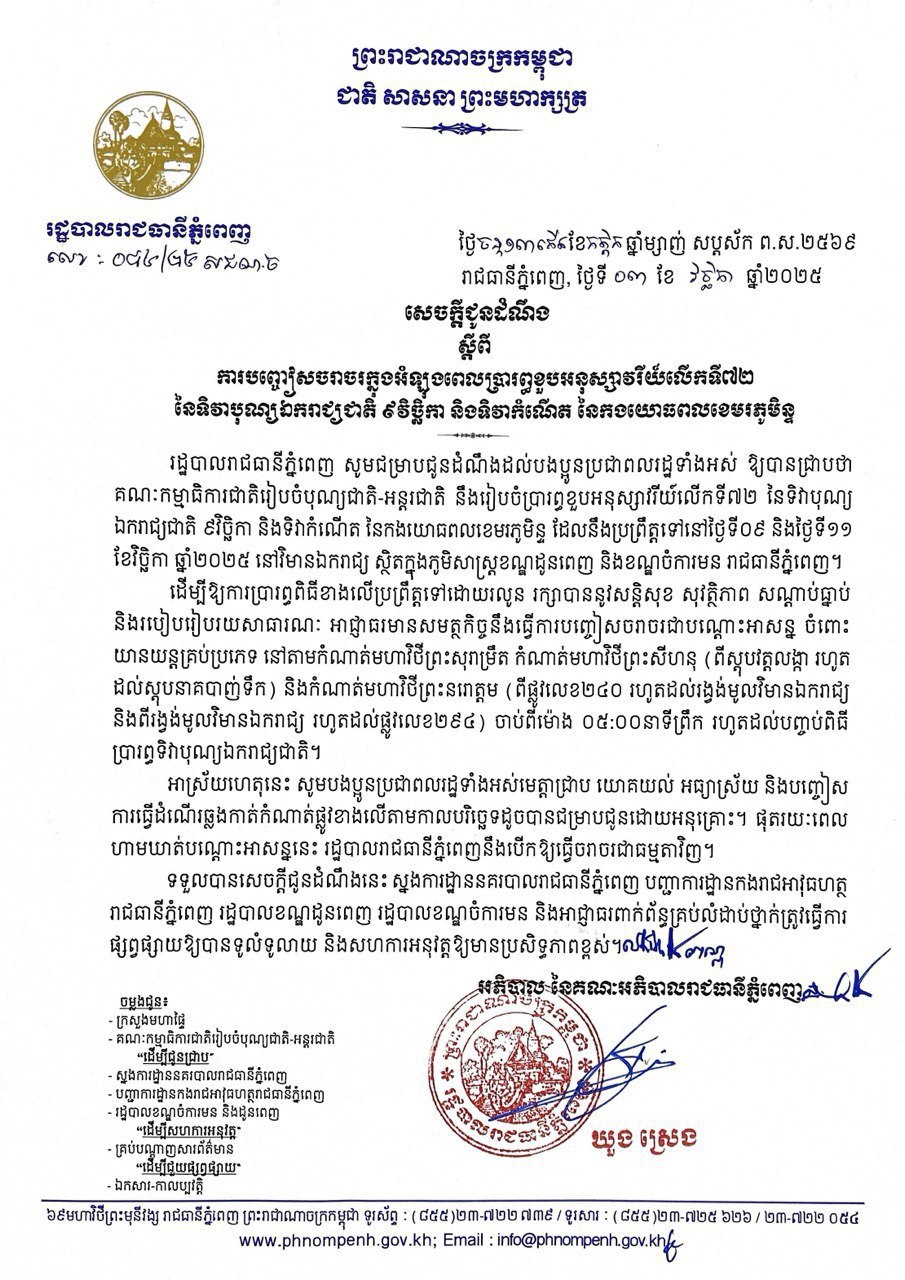 រដ្ឋបាលរាជធានីភ្នំពេញ ជូនដំណឹងពីការបញ្ចៀសចរាចរអំឡុងពេលប្រារព្ធខួបអនុស្សាវរីយ៍លើកទី៧២ នៃទិវាបុណ្យឯករាជ្យជាតិ ភាសាខ្មែរ -2025/11/03 1,086 រដ្ឋបាលរាជធានីភ្នំពេញ សូមជម្រាបជូនដំណឹងដល់បងប្អូនប្រជាពលរដ្ឋទាំងអស់ ឱ្យបានជ្រាបថា : 责编 ek - Advertise - © 《柬华日报》版权所有