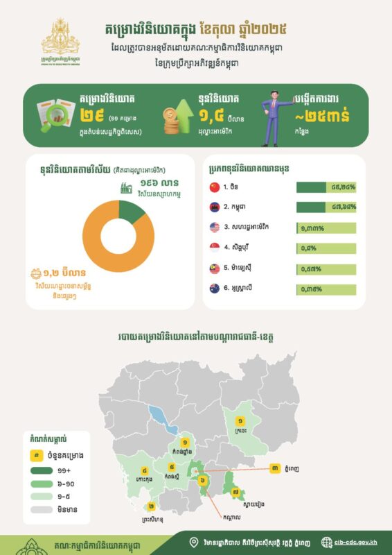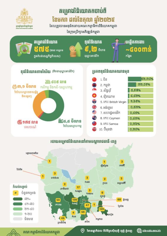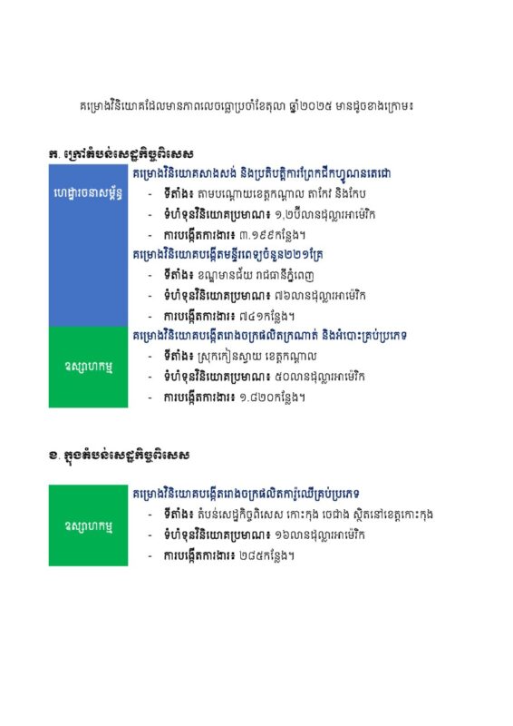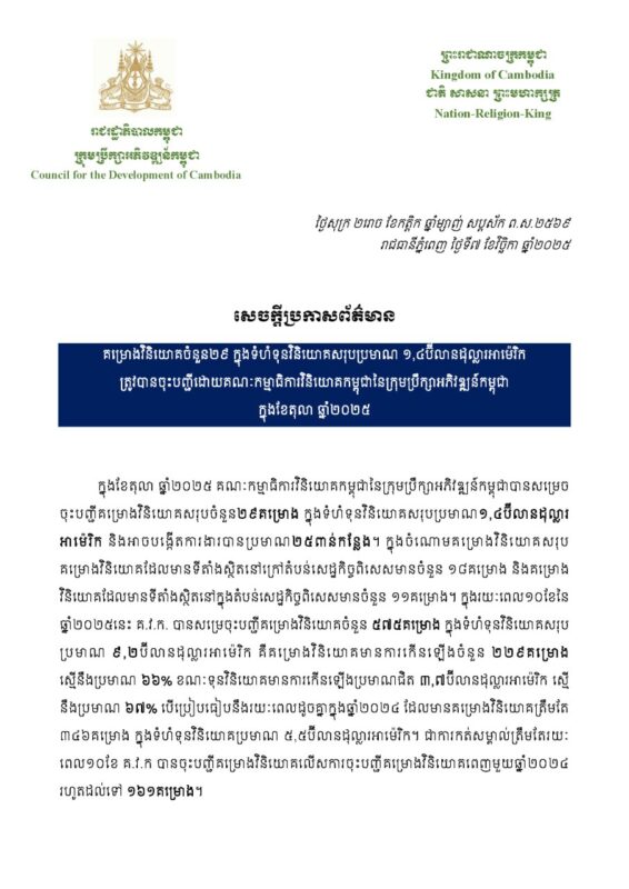 កម្ពុជាអនុម័តគម្រោងវិនិយោគចំនួន ៥៧៥គម្រោងក្នុងទំហំទុនវិនិយោគសរុប ៩.២ប៊ីលានដុល្លារអាម៉េរិក នៅរយៈពេល១០ខែ ឆ្នាំ២០២៥ ភាសាខ្មែរ -2025/11/07 1,104 គណៈកម្មាធិការវិនិយោគកម្ពុជានៃក្រុមប្រឹក្សាអភិវឌ្ឍន៍កម្ពុជា បានសម្រេចុះបញ្ជីគម្រោងវិនិយោគចំនួន ៥៧៥គម្រោង ក្នុងទំហំទុនវិនិយោគសរុបប្រមាណ ៩.២ប៊ីលានដុល្លារអាម៉េរិក នៅរយៈពេល១០ខែ ឆ្នាំ២០២៥។ នេះបើតាមសេចក្តីប្រកាសព័ត៌មានរបស់ក្រុមប្រឹក្សាអភិវឌ្ឍន៍កម្ពុជា។ 责编 ek - Advertise - © 《柬华日报》版权所有