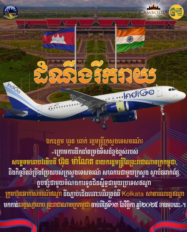 华哈部长指出:“在洪玛奈总理的英明领导下,通过旅游部与各相关部委机构的紧密合作,并得益于柬埔寨与印度之间日益密切的外交关系,我们成功推动IndiGo 航空公司于2025年11月13日起开通从印度加尔各答至柬埔寨暹粒的直飞航线。”