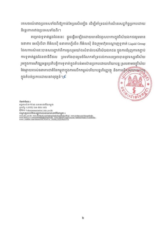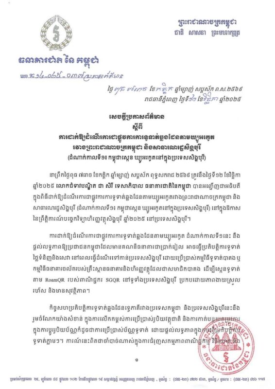 កម្ពុជា-សិង្ហបុរី ដាក់ឱ្យដំណើរការជាផ្លូវការ ការទូទាត់ឆ្លងដែនតាម QR Code ភាសាខ្មែរ -2025/11/13 1,063 លោកស្រីបណ្ឌិត ជា សិរី ទេសាភិបាលធនាគារជាតិនៃកម្ពុជា បានអញ្ជើញជាអធិបតីក្នុងពិធីដាក់ឱ្យដំណើរការជាផ្លូវការ ការទូទាត់ឆ្លងដែនតាម QR Code រវាងប្រទេសកម្ពុជា និងសាធារណរដ្ឋសិង្ហបុរី ដំណាក់កាលទី១ ដោយអនុញ្ញាតឲ្យប្រជាជនកម្ពុជាអាចស្កេន QR Code នៅក្នុងប្រទេសសិង្ហបុរី។ FRESH NEWS 责编 ek - Advertise - © 《柬华日报》版权所有
