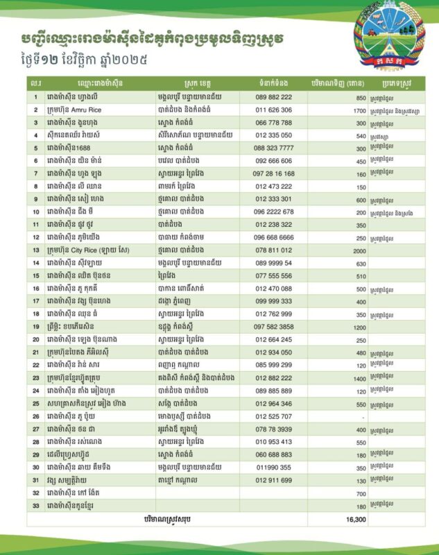 យោងតាមលោក យ៉ង់ សាំងកុមារ រដ្ឋលេខាធិការក្រសួងកសិកម្ម រុក្ខាប្រមាញ់ និងនេសាទបានឱ្យដឹងថា បរិមាណស្រូវប្រមូលទិញប្រចាំថ្ងៃកើនឡើងជាងបន្តបន្ទាប់។ ជាក់ស្តែង នៅថ្ងៃទី១២ ខែវិច្ឆិកា ឆ្នាំ២០២៥ រោងម៉ាស៊ីនចំនួន៣៣ ដែលជាដៃគូសហការជាមួយក្រសួងកសិកម្ម ប្រមូលទិញស្រូវបាន ១៦០០០តោន ដែលធ្វើឲ្យបរិមាណប្រមូលទិញស្រូវកើនជាងថ្ងៃទី១១ ខែវិច្ឆិកា ដែលមានបរិមាណតែ១៥ ០០០ តោន៕