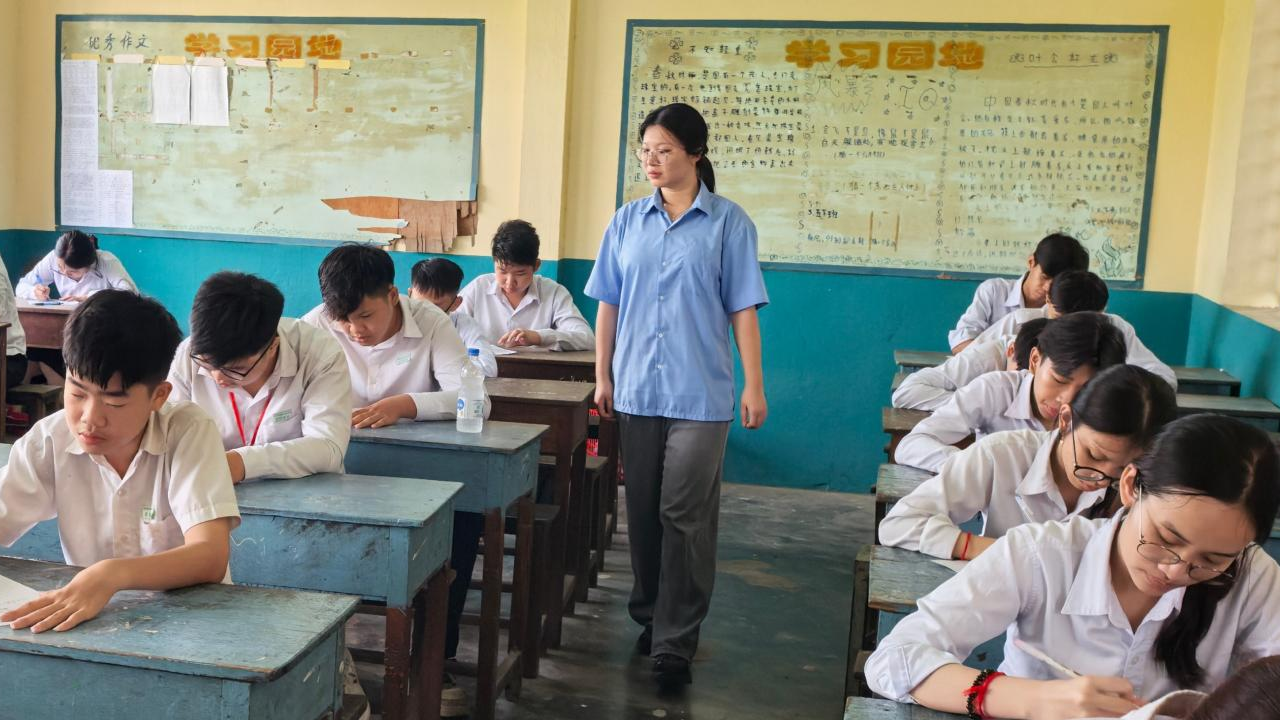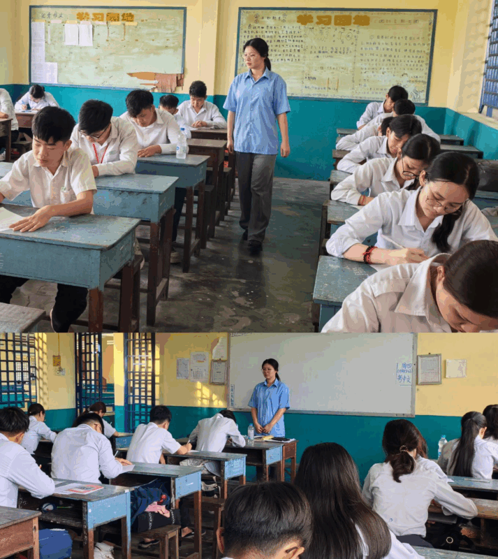 比赛期间,学校教务处主任亲自来到考场巡视,查看比赛秩序,了解学生写作状态。考场内,身着白色校服的学生们端坐于蓝色课桌前,或低头思索,或提笔书写,教室里只听见笔尖划过纸张的“沙沙”声,更衬出学生们对写作的专注——他们将日常所学融入文字,把对生活的观察、对身边人事的感悟化作笔下流淌的语句,让华文的魅力在字里行间静静绽放。