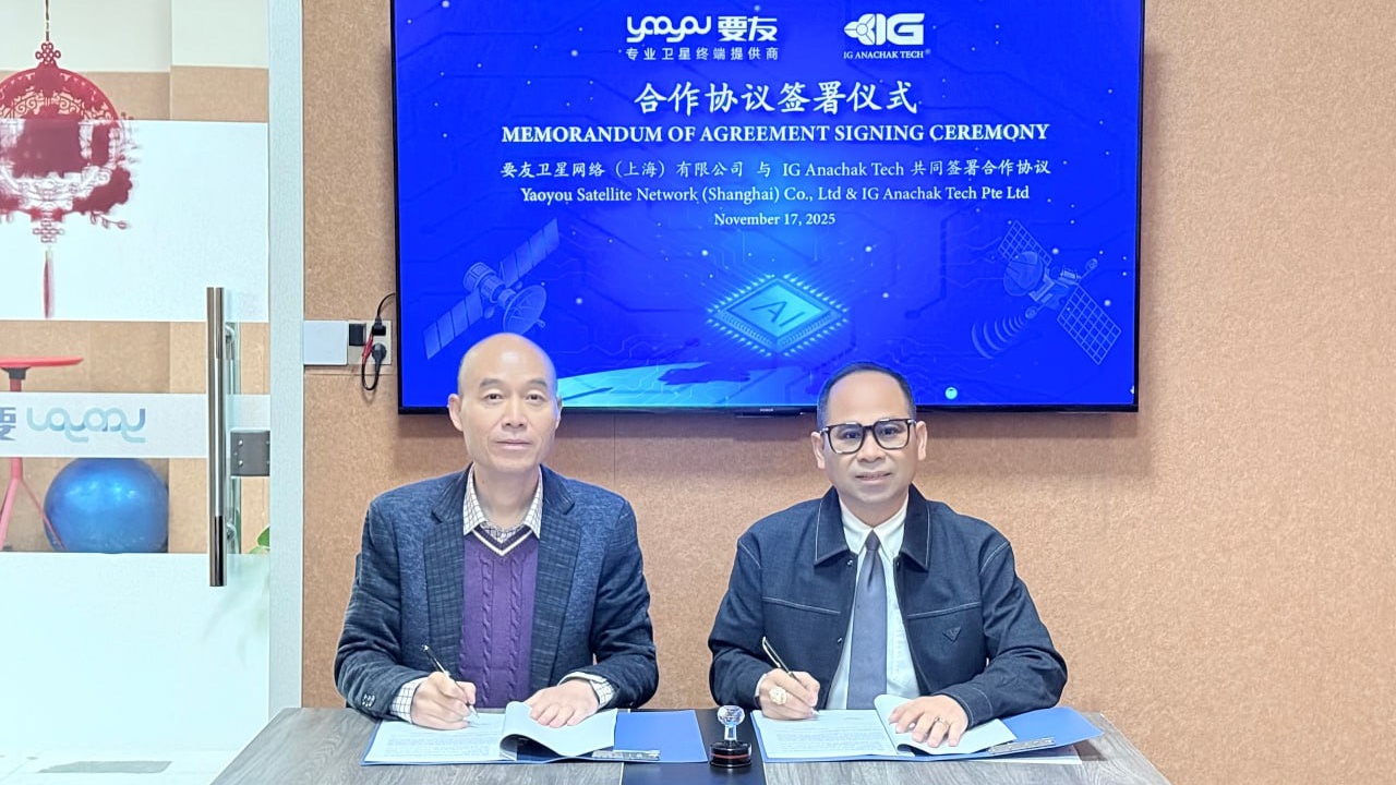 【本报消息】本月17日,Yaoyou Satellite Network(上海)有限公司与柬埔寨企业IG Anachak Tech Pte Ltd共同宣布,双方正式签署合作备忘录,将携手在东南亚地区开展卫星通信解决方案的市场拓展与联合开发。