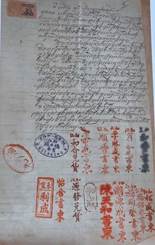 (此照片为:九十六年前,侨贤华胞们联合盖章申请办学的文件,原件收藏于柬埔寨国家博物館。)